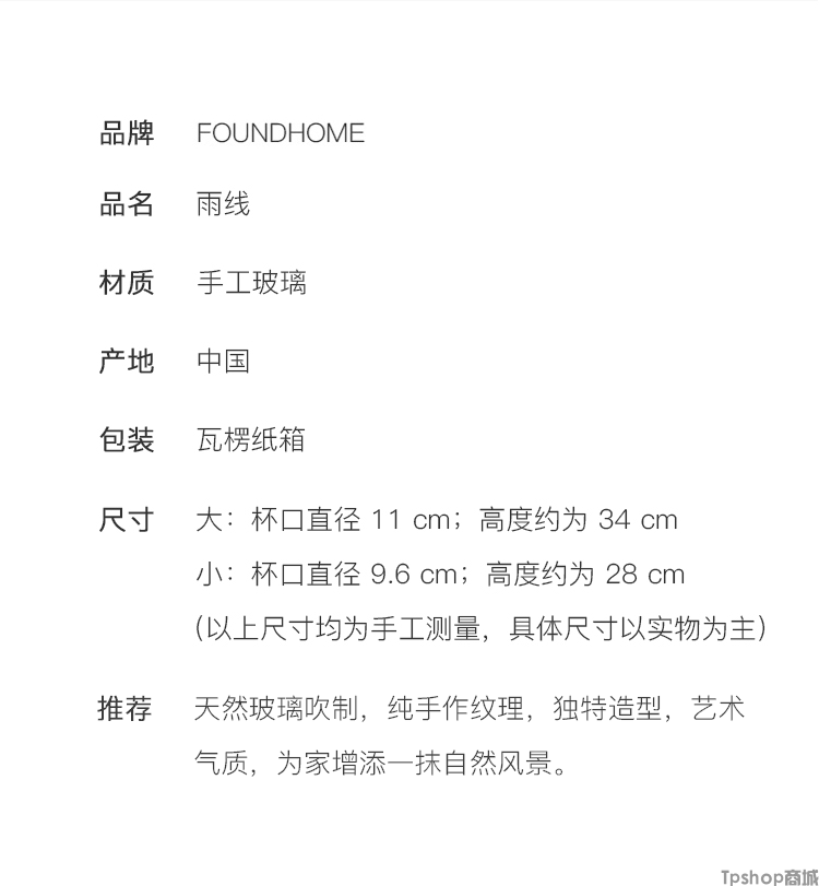 商品名称:FOUNDHOME 雨线花瓶现代简约手工玻璃插花客厅餐厅家居花艺摆件