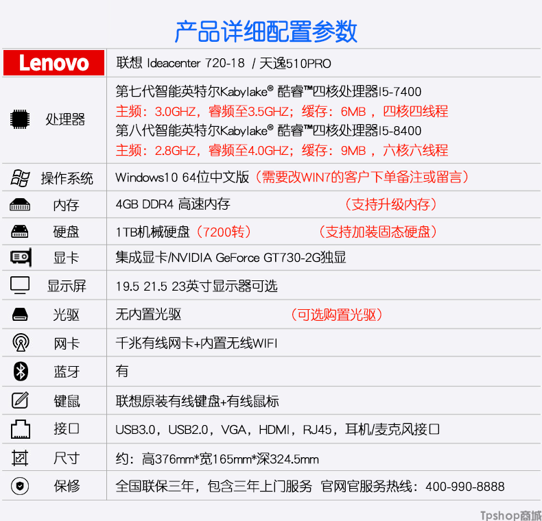 商品名称:联想电脑台式机X315/510Pro/T4900V六核I5-8500 8G1T 2G主机整机